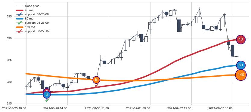 上涨趋势08-25 10:00-09-07 11:00,均线40, 80, 140确认关键支撑2处
