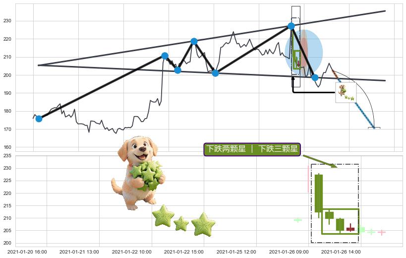 | 6 🅚:三只乌鸦 ➕ 📐:扩散三角反转下行突破支撑位破位, 猜想持续下沉下跌,被突破的支撑位已变为阻力位 ☞ 看空信号 ⇥ 【🅚线】交织【图形】⇥ 综合量化分数: 49 | > |