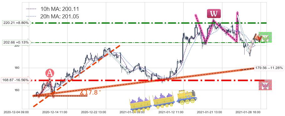 ♘ 支撑价格位168.87,可信任强度92.22%,距离最后交易2021-01-28 16:00形成的收盘价格202.40相差 -16.56%