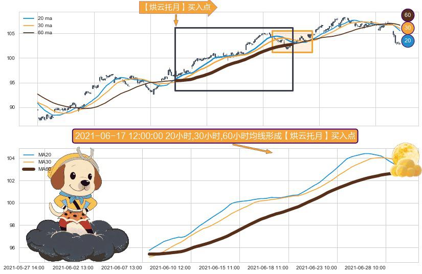 形态多维评估: ⚀ 2021-06-08 09:00:00小时-2021-06-29 09:00:00小时显现 20小时-30小时-60小时均线 【烘云托月】买入点 看多信号,后市看涨,买入