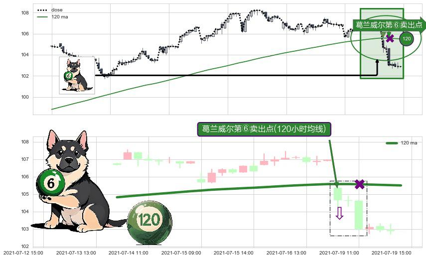 形态多维评估: ⚀ 2021-07-19 09:00:00-小时显现 葛兰威尔均线 120小时均线 第⑥卖出点 走势反转见顶信号,后市看跌,卖出信号