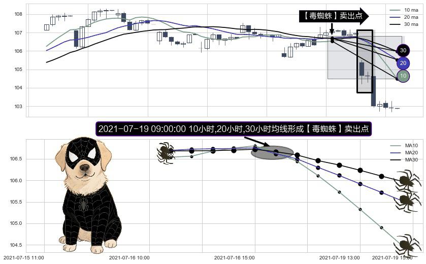形态多维评估: ⚀ 2021-07-19 09:00:00小时显现 10小时-20小时-30小时均线 【毒蜘蛛】卖出点 看空信号,后市看跌,卖出