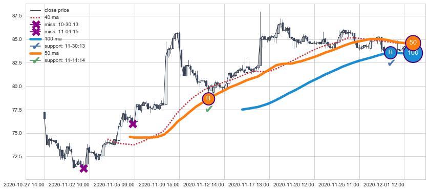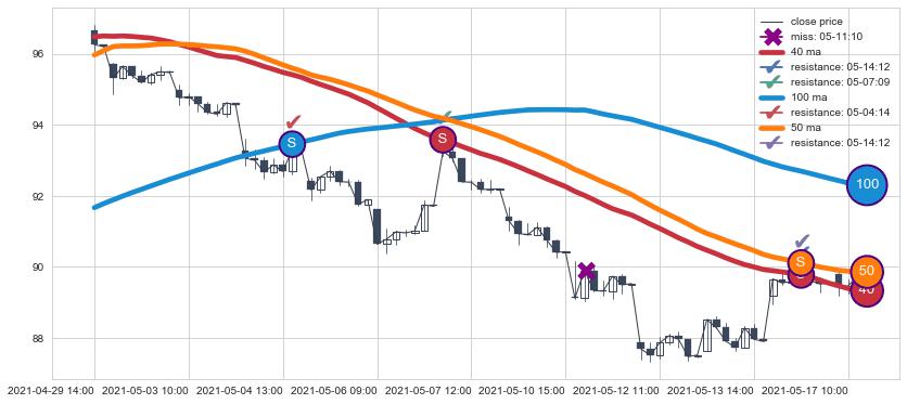 下跌趋势04-29 14:00-05-17 11:00,均线40, 50, 100确认关键阻力3处