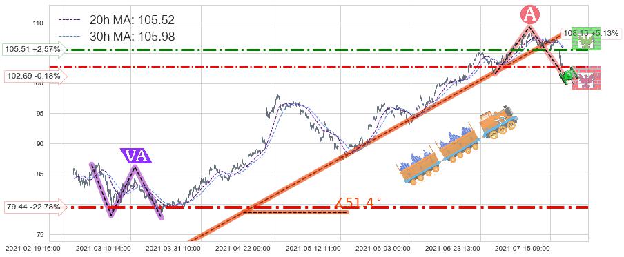 ♘ 阻力价格位105.51,可信任强度67.56%,距离最后交易2021-07-19 15:00形成的收盘价格102.87相差 +2.57%