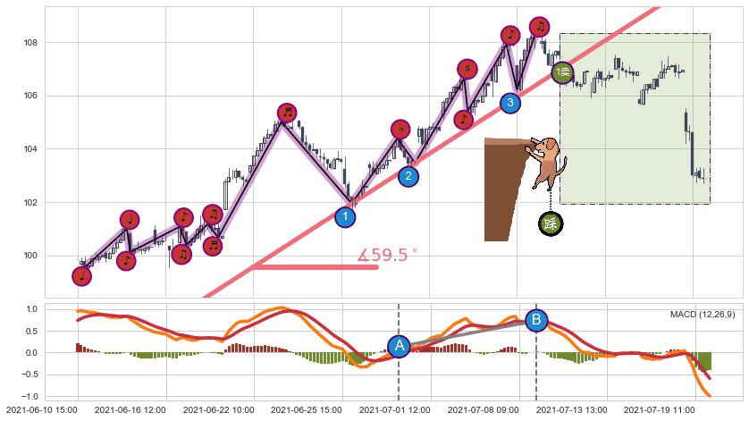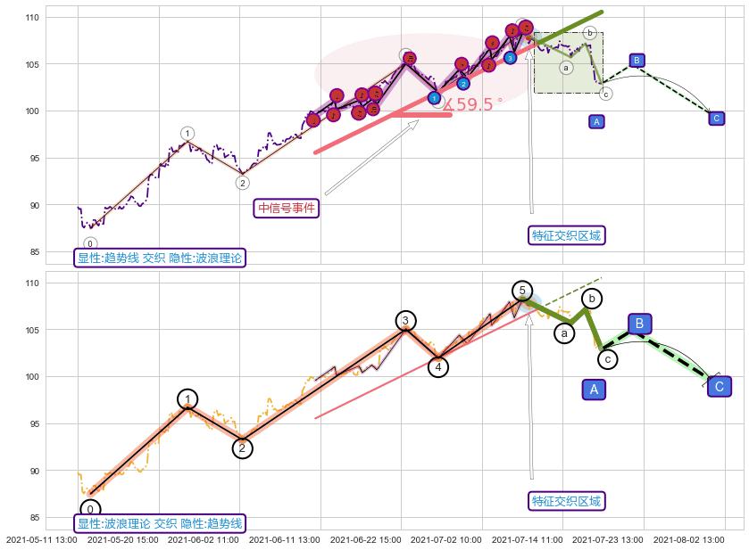 ➢ 最后的上涨趋势2021-06-11 10:00至2021-07-12 10:00:存在破位迹象,后续小调整或者反转下跌