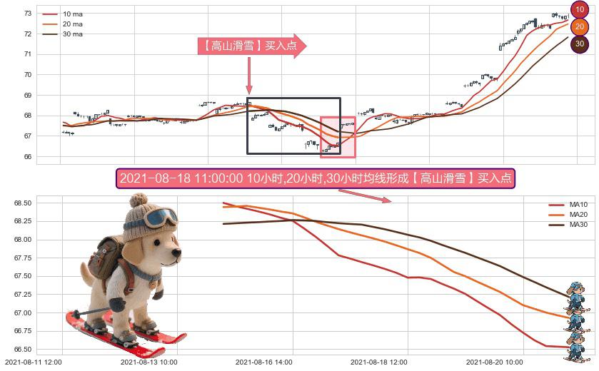 形态多维评估: ⚀ 2021-08-13 14:00:00小时-2021-08-20 14:00:00小时显现 10小时-20小时-30小时均线 【高山滑雪】买入点 看多信号,后市看涨,买入