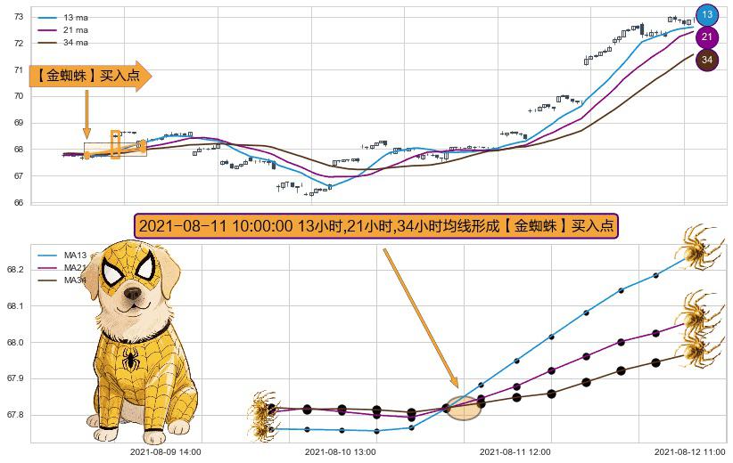 形态多维评估: ⚀ 2021-08-11 10:00:00小时显现 13小时-21小时-34小时均线 【金蜘蛛】买入点 看多信号,后市看涨,买入
