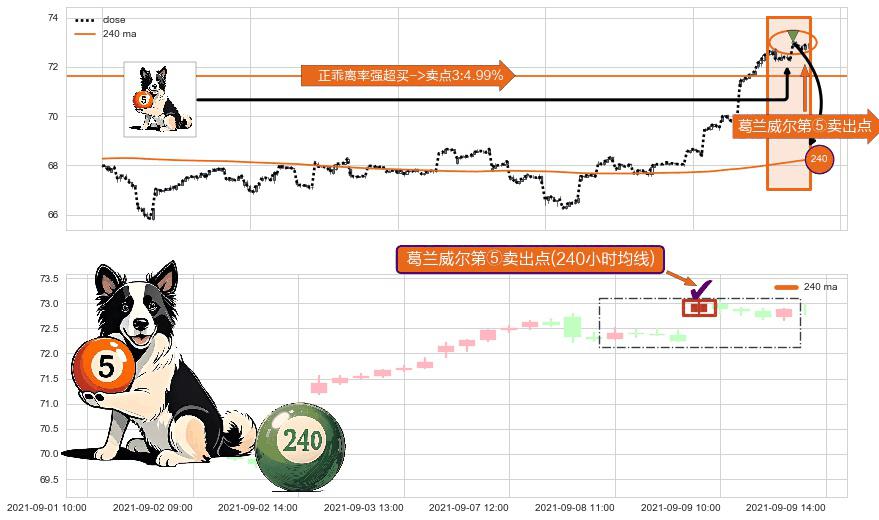 形态多维评估: ⚀ 2021-09-09 09:00:00-小时显现 葛兰威尔均线 240小时均线 第⑤卖出点 上升趋势均值回复的短线回落信号,后市看跌,卖出信号
