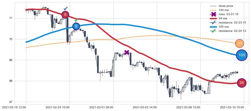 下跌趋势02-19 12:00-03-10 15:00,均线105, 34确认关键阻力2处