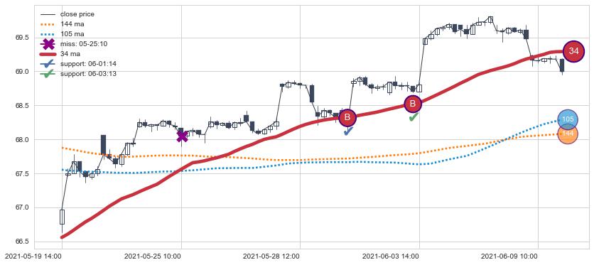 上涨趋势05-19 14:00-06-09 14:00,均线34确认关键支撑2处
