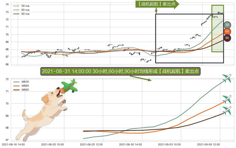 形态多维评估: ⚀ 2021-08-23 14:00:00小时-2021-09-09 14:00:00小时显现 30小时-60小时-90小时均线 【战机起航】卖出点 看空信号,后市看跌,卖出