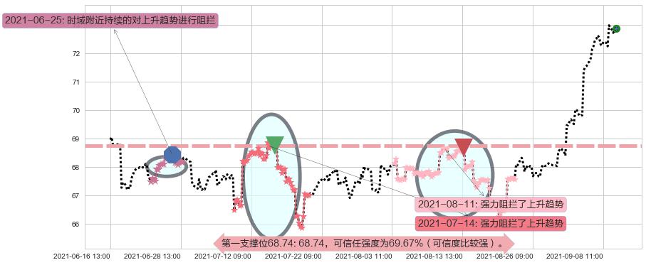 2021-06-25: 时域附近第一支撑位68.74持续的对上升趋势进行阻拦,有效放缓了上涨的速度。