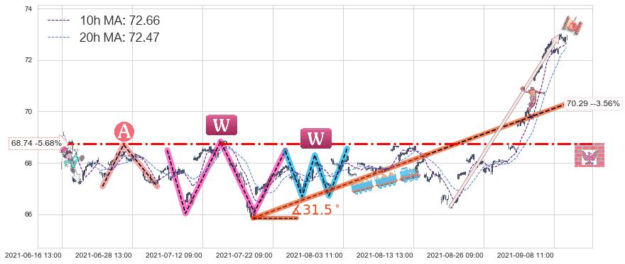2021-07-14: 第一支撑位68.74强力阻拦了上升趋势,成功阻止了价格的继续上涨。