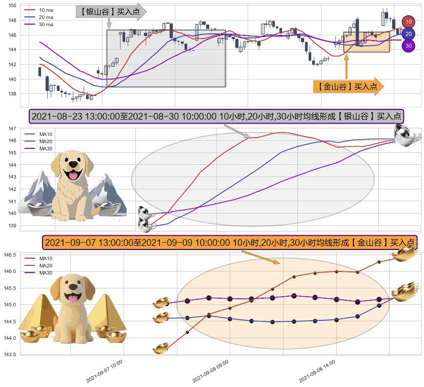 ⚃ 2021-09-07 14:00:00-小时至2021-09-09 10:00:00-小时显现 10小时-20小时-30小时均线 【金山谷】买入点 其再次确认了买入信号,可靠性更强,买入