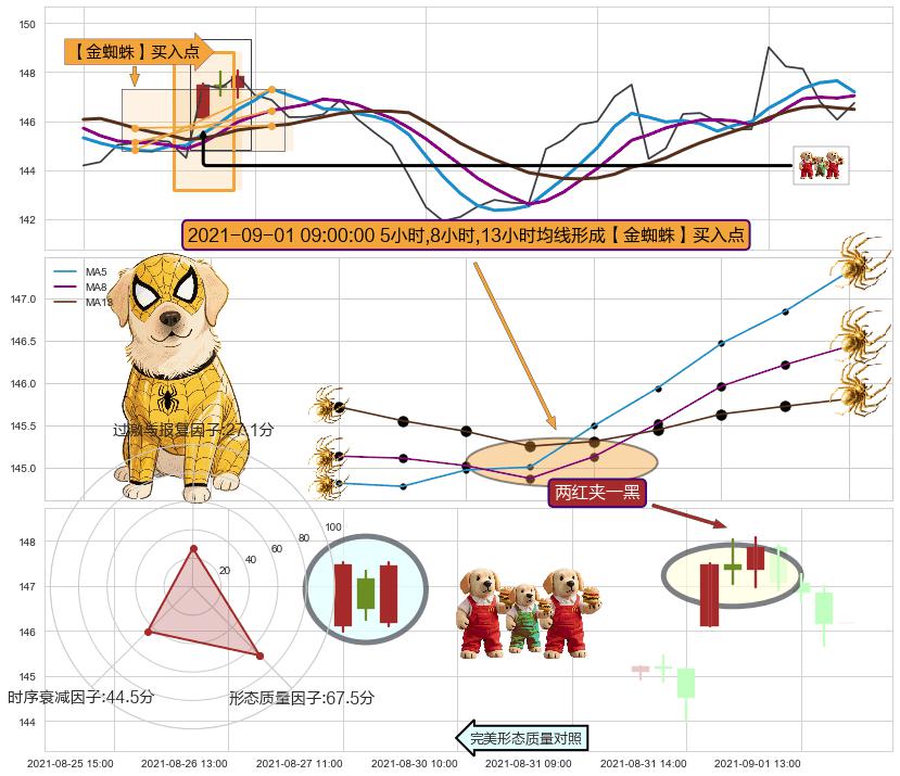 从2021-09-07 14:00至2021-09-09 09:00,共包含9个小时,阶段股价上涨1.08%,阶段股价变动位移路程比: 1 : 5