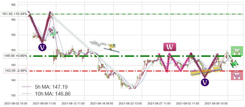 ♘ 阻力价格位148.06,可信任强度89.98%,距离最后交易2021-09-09 14:00形成的收盘价格146.74相差 +0.90%
