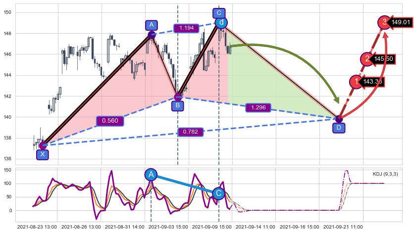 ➣ 未完成【赛福】形态起点X: 08-20:13, 已到达C点: 09-09:09, 预测最终D点: 09-17:16, 共136交易小时