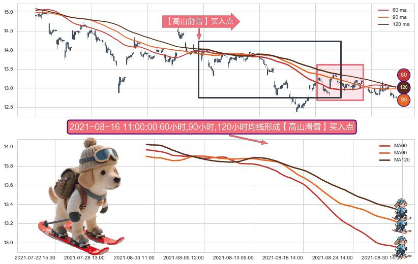 ⚀ 2021-08-02 14:00:00小时-2021-08-30 11:00:00小时显现 60小时-90小时-120小时均线 【高山滑雪】买入点 看多信号,后市看涨,买入