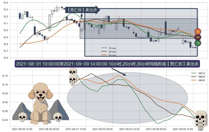 ⚀ 2021-08-31 11:00:00-小时至2021-09-09 14:00:00-小时显现 10小时-20小时-30小时均线 【死亡谷】卖出点 看空信号,后市看跌,卖出