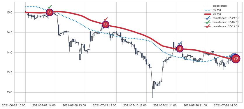 ⚂ 第⑦卖出点 刚刚再次反弹均线向下回落, 阻力 效果并未十分稳固,属于【激进】的卖出信号,高时效看空信号