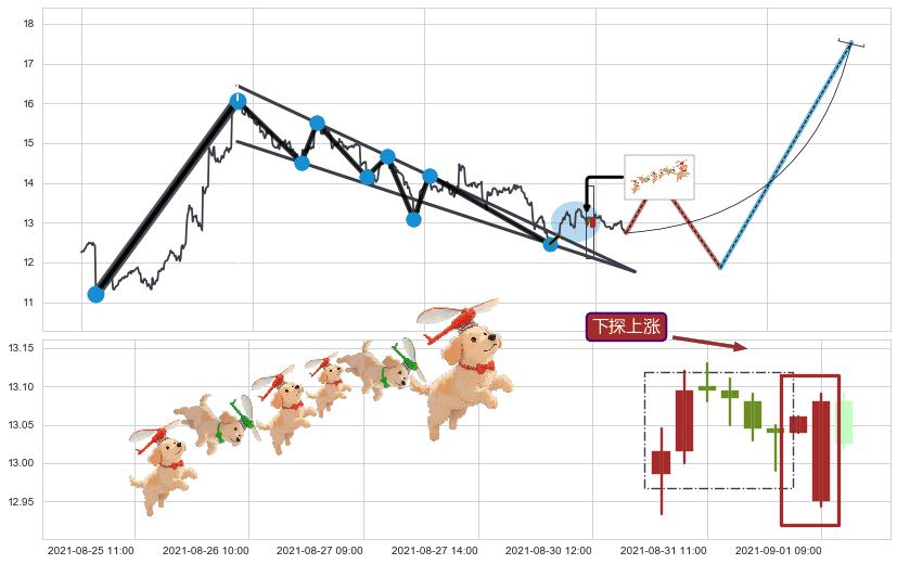 从2021-08-20 09:00至2021-09-09 14:00,共包含90个小时,阶段股价上涨2.32%,阶段股价变动位移路程比: 1 : 13