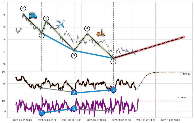 ➣ 第一, 三驱动浪端点:【KDJ】走势出现【常规背离 & 反转信号】背离程度55.90%,背离夹角角度82.8˚,背离程度中等