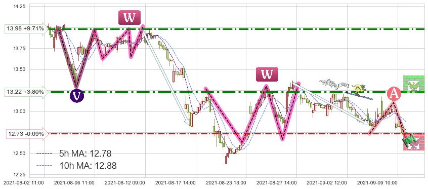 ♘ 阻力价格位13.98,可信任强度64.71%,距离最后交易2021-09-09 14:00形成的收盘价格12.74相差 +9.71%