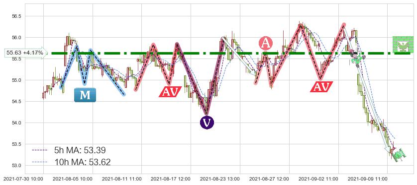 2021-08-20: 第一阻力位55.63起到了持续的支撑作用,有效地促进了价格的回升。