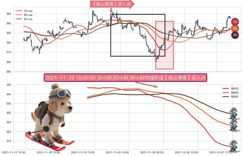 形态多维评估: ⚀ 2021-11-19 09:00:00小时-2021-12-07 10:00:00小时显现 30小时-60小时-90小时均线 【高山滑雪】买入点 看多信号,后市看涨,买入