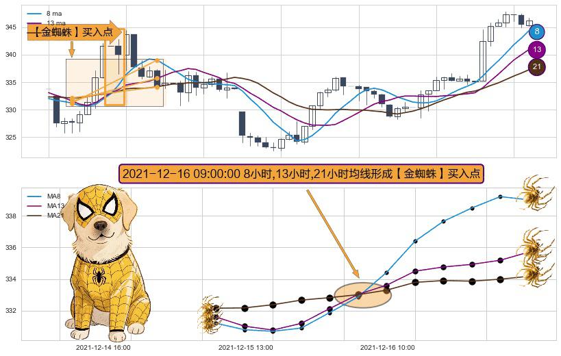 形态多维评估: ⚀ 2021-12-16 09:00:00小时显现 8小时-13小时-21小时均线 【金蜘蛛】买入点 看多信号,后市看涨,买入
