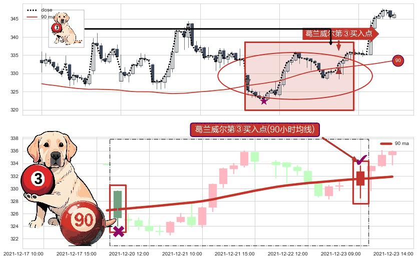 形态多维评估: ⚀ 2021-12-23 09:00:00-小时显现 葛兰威尔均线 90小时均线 第③买入点 上升趋势的中继信号,后市看涨,买进信号