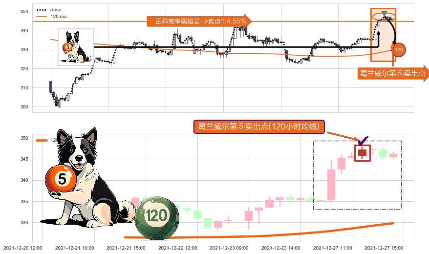 形态多维评估: ⚀ 2021-12-27 12:00:00-小时显现 葛兰威尔均线 120小时均线 第⑤卖出点 上升趋势均值回复的短线回落信号,后市看跌,卖出信号