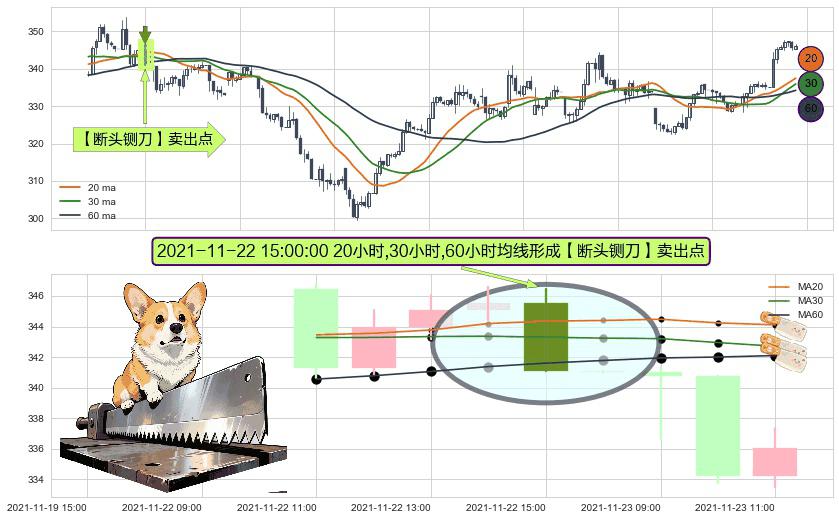 形态多维评估: ⚀ 2021-11-22 15:00:00小时显现 20小时-30小时-60小时均线 【断头铡刀】卖出点 看空信号,后市看跌,卖出