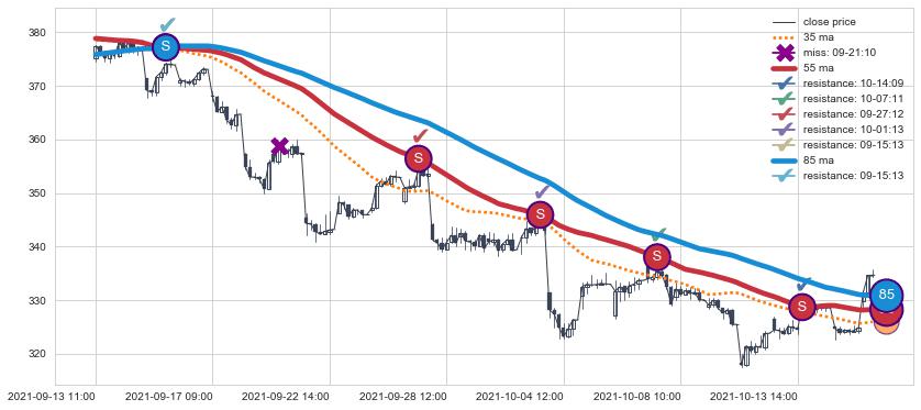 下跌趋势09-13 11:00-10-18 11:00,均线85, 55确认关键阻力5处