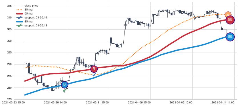 上涨趋势03-23 15:00-04-14 11:00,均线85, 55确认关键支撑2处