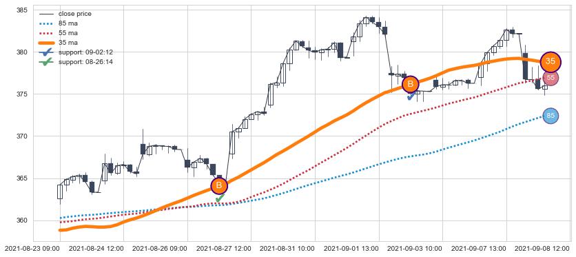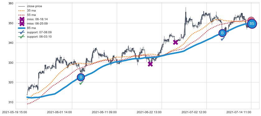 上涨趋势05-19 15:00-07-14 11:00,均线85确认关键支撑2处