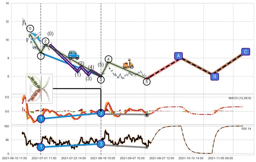 ➣ 第一, 三, 五浪下跌动能逐渐【衰弱变小】,趋势呈现不稳迹象