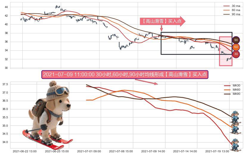 形态多维评估: ⚀ 2021-06-29 13:00:00小时-2021-07-19 15:00:00小时显现 30小时-60小时-90小时均线 【高山滑雪】买入点 看多信号,后市看涨,买入
