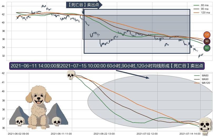 形态多维评估: ⚀ 2021-06-11 15:00:00-小时至2021-07-15 10:00:00-小时显现 60小时-90小时-120小时均线 【死亡谷】卖出点 看空信号,后市看跌,卖出