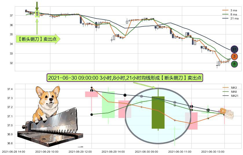 形态多维评估: ⚀ 2021-06-30 09:00:00小时显现 3小时-8小时-21小时均线 【断头铡刀】卖出点 看空信号,后市看跌,卖出