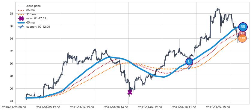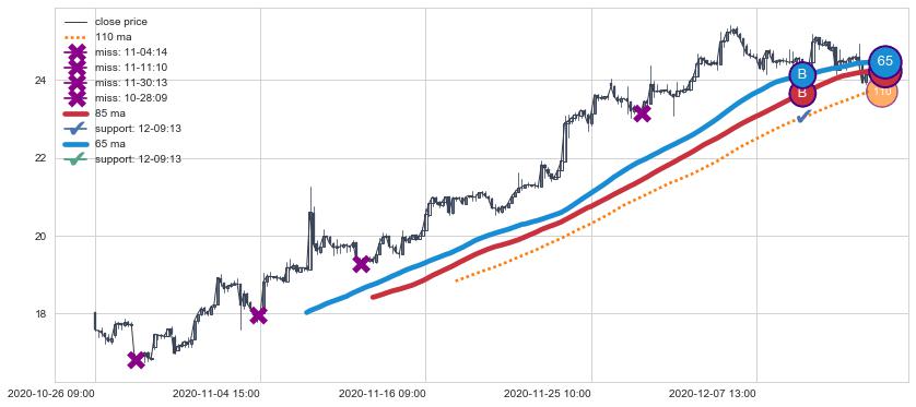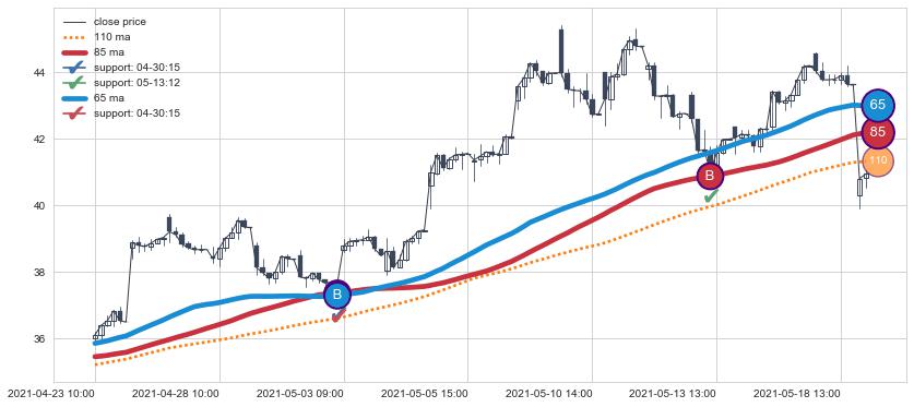 上涨趋势04-23 10:00-05-19 10:00,均线65, 85确认关键支撑2处