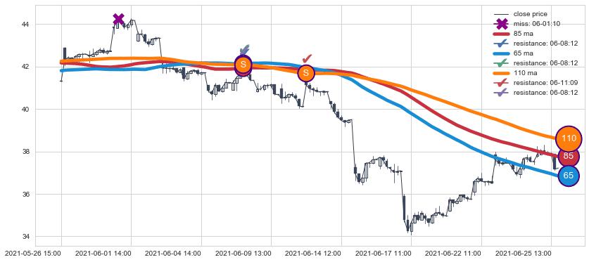 下跌趋势05-26 15:00-06-25 15:00,均线65, 85, 110确认关键阻力2处