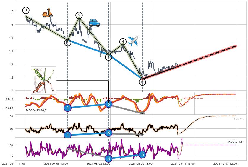 ➣ 1,3,5驱动浪MACD, RSI, KDJ走势都出现【常规背离】反转信号增强