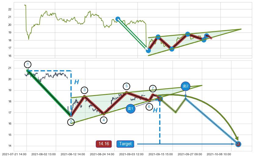 从2021-05-13 12:00至2021-06-23 14:00,共包含186个小时,阶段股价上涨7.36%,阶段股价变动位移路程比: 1 : 15