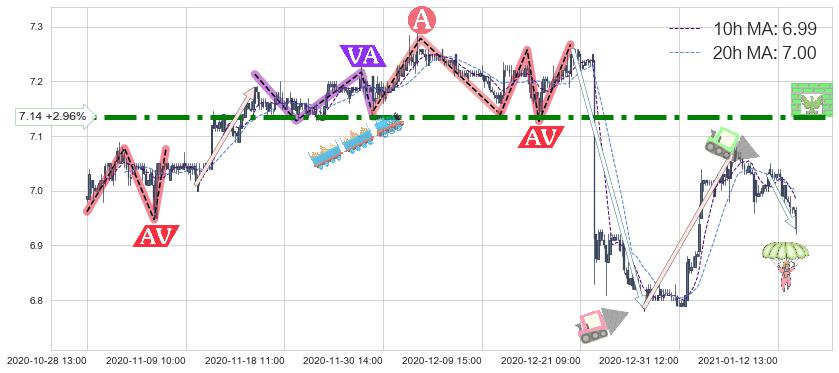 2020-11-11: 第一阻力位7.14强力阻拦了上升趋势,成功阻止了价格的继续上涨。