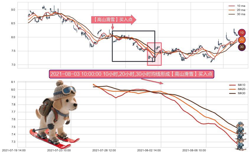 形态多维评估: ⚀ 2021-07-26 14:00:00小时-2021-08-10 12:00:00小时显现 10小时-20小时-30小时均线 【高山滑雪】买入点 看多信号,后市看涨,买入