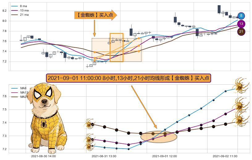 形态多维评估: ⚀ 2021-09-01 11:00:00小时显现 8小时-13小时-21小时均线 【金蜘蛛】买入点 看多信号,后市看涨,买入