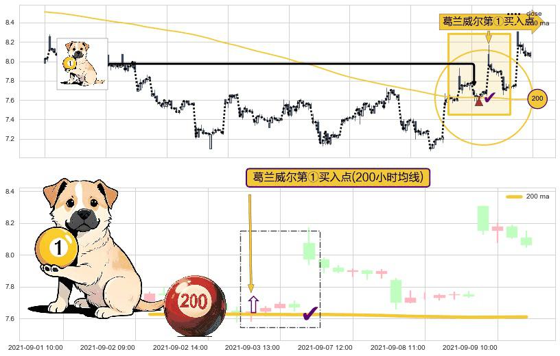形态多维评估: ⚀ 2021-09-03 11:00:00-小时显现 葛兰威尔均线 200小时均线 第买①入点 走势反转见底信号,后市看涨,买进信号
