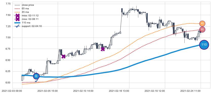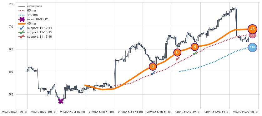 上涨趋势04-21 13:00-05-28 09:00,均线65, 110确认关键支撑3处
