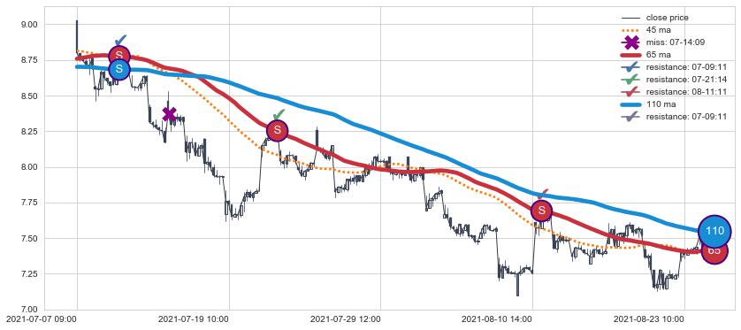 下跌趋势07-07 09:00-08-24 10:00,均线65, 110确认关键阻力3处
